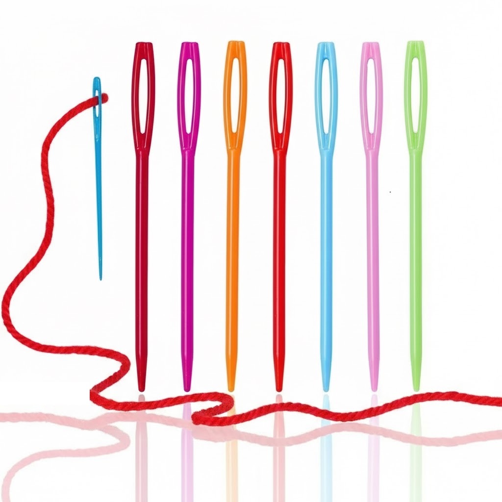 Zestaw kolorowych plastikowych igieł przeznaczonych dla dzieci do nauki haftu, szycia oraz prac kreatywnych z filcu i włóczki. Igły są lekkie, bezpieczne i mają zaokrągloną końcówkę, dzięki czemu idealnie nadają się dla najmłodszych użytkowników.