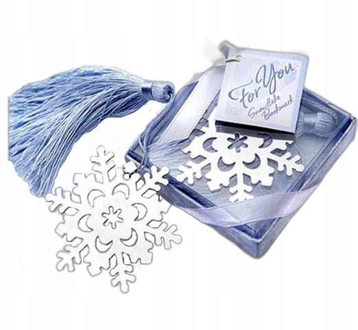 Elegancka zakładka do książki w kształcie śnieżynki wykończona błękitnym chwostem.