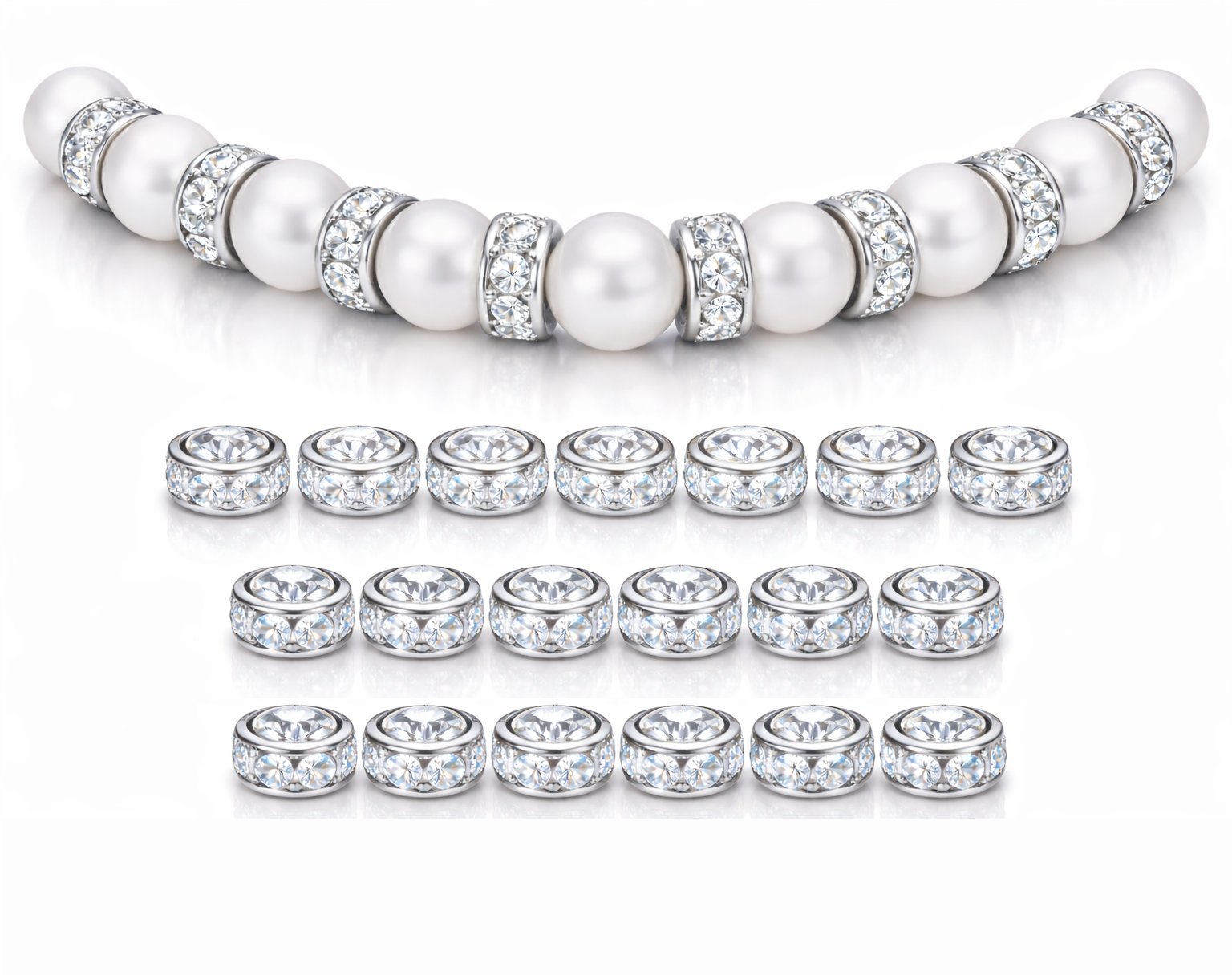 Stylowe przekładki jubilerskie zdobione błyszczącymi, okrągłymi cyrkoniami o diamentowym szlifie. Pięknie odbijają światło, dodając biżuterii luksusowego charakteru i wyrazistego blasku. Idealne do bransoletek, naszyjników oraz projektów handmade. Wysoka jakość wykonania i ponadczasowy design sprawiają, że doskonale komponują się z perłami, koralikami.