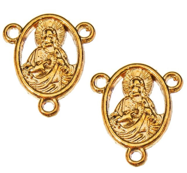 Łączniki do robienia różańca dwustronne Matka Boska i Jezus wykonane z metalu w kolorze złotym.