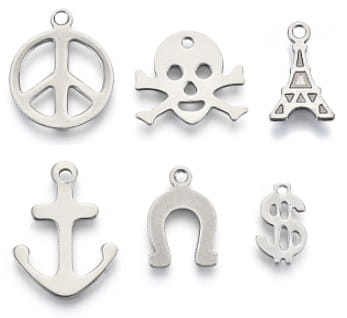 Zawieszki charms -mix: znak peace, trupia czaszka, wieża Eiffla, kotwica, podkowa, znak dolara wykonane ze stali nierdzerwnej, wycinane laserem.