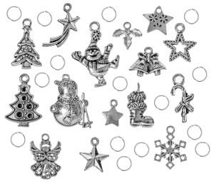 Mix zawieszek charms wykonanych ze srebra tybetańskiego w kolorze srebrnym i antycznym srebrnym w świątecznej wersji.