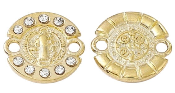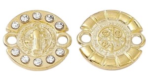 Elegancki, subtelny łącznik wysadzany cyrkoniami w kolorze Crystal z Jezusem w środku, wykonany z metalu w kolorze złotym, idealny do wykonania bransoletek typu różaniec, które mogą być doskonałym prezentem na Komunię, Chrzest czy Dzień Babci.