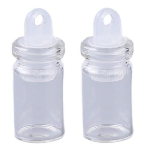 Szklane buteleczki z plastikową zatyczką, idealne do przechowywania drobnych koralików, zawieszenia jako brelok czy wisiorek.