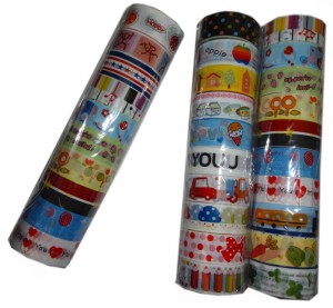 Komplet 10 rolek taśmy samoprzylepnej z kolorowym nadreukiem. Mix wzorów.