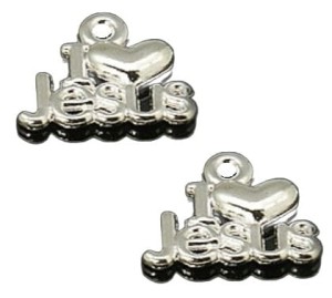 Zawieszki charms, I LOVE JESUS, wykonane z metalu w kolorze jasnym srebrnym idealne do robienia dewocjonalii, ozdób na Komunie.
