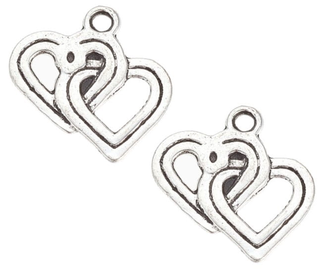Zawieszki charms podwójne serca wykonane ze srebra tybetańskiego idealne do robienia biżuterii i breloków.