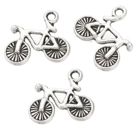 Zawieszki charms rowery wykonane z metalu w kolorze antycznym srebrnym.