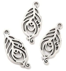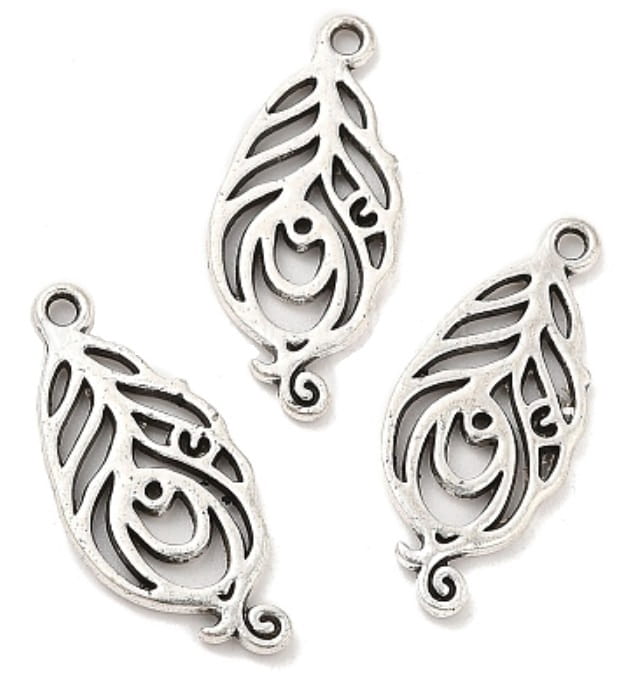 Zawieszki charms - wisiorki, ozdobne pióra pawie wykonane z metalu w kolorze antycznym srebrnym idealne do wykonywania biżuterii.