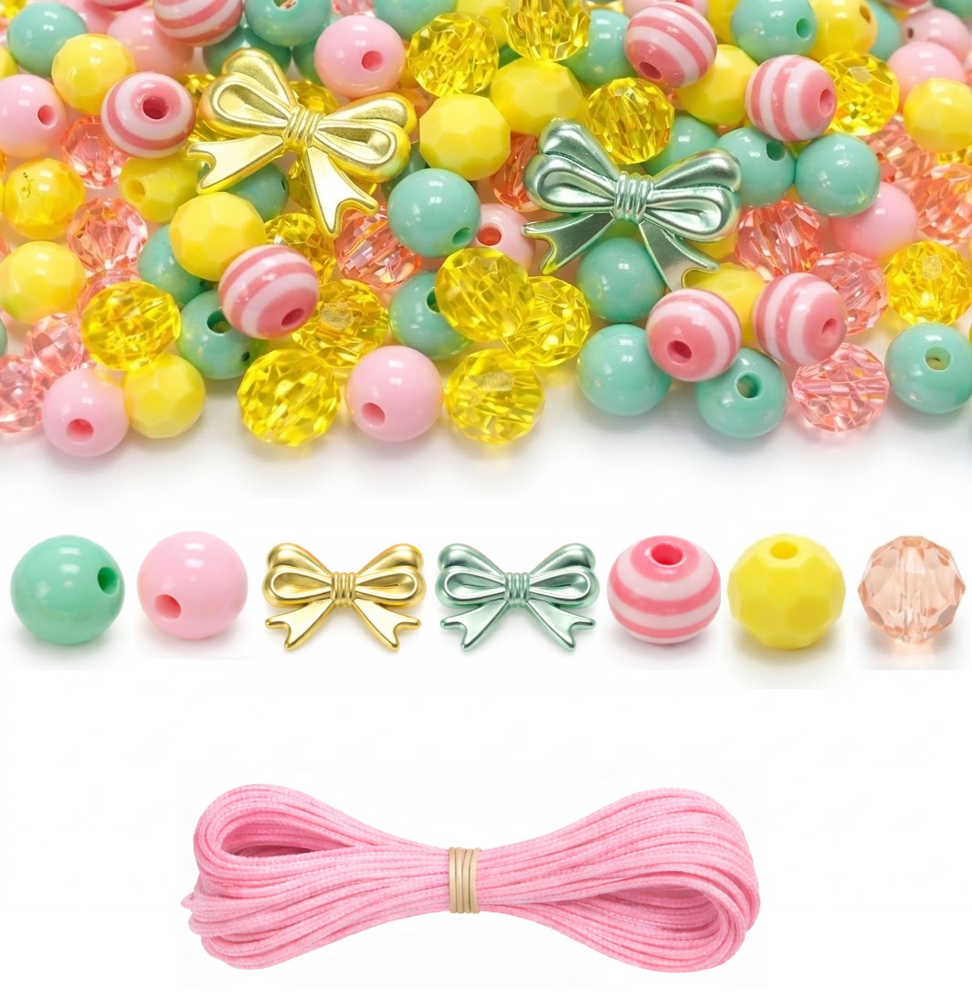 W skład zestawów wchodzi 100szt koralików w tonacji kolorystycznej różowo-zielono- żółtej.