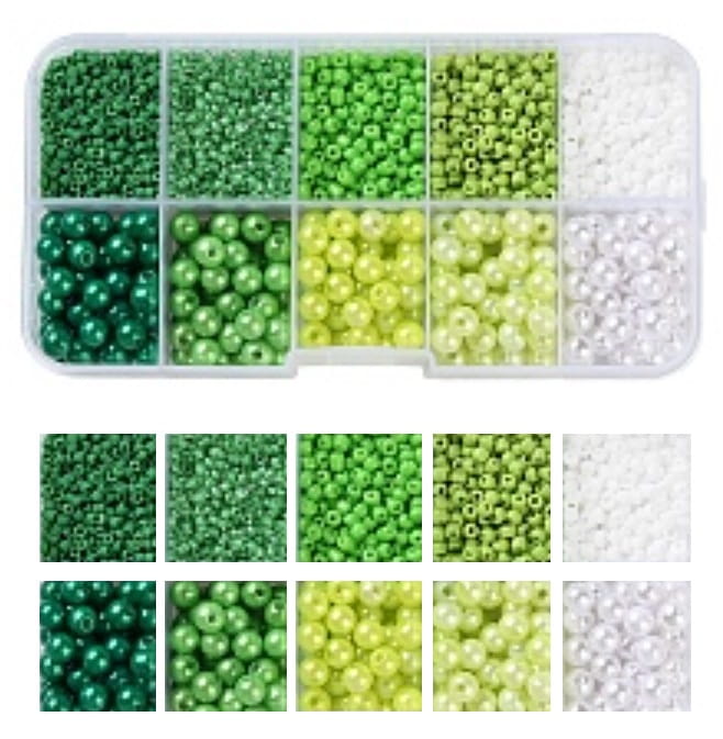 Rozmiar koralików szklanych to 2/3-2,5/2,5mm, natomiast aktylowe perełki są w rozmiarze 4 i 6mm. Dziurki w koralikach mają otwór od 0,8mm do 1,6mm.