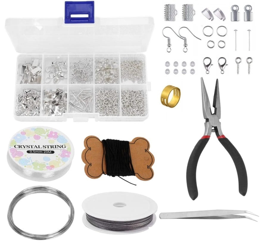 W zestawie znajdują się również szczypce precyzyjne, pęseta, gumka, czarny sznurek woskowany, drut pamięciowy, linka jubilerska, oraz baza pierścionka.