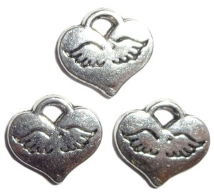 Zawieszki charms serca metalowe ze skrzydłami w kolorze antycznym srebrnym.